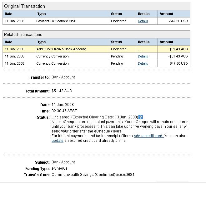 im new to paypal and ebay, this was my first win. I won it on the 10th and when i payed paypal said it would be cleared by 13th...its now the 16th and it still shows 'uncleared' next to 'add funds from a bank account', yet my bank account transaction record says that paypal took the $51.43 from my account.