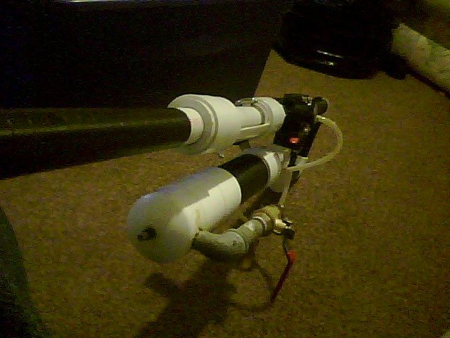 -A metal pipe fixture with a ball valve on the end of it with a adapter to let in pressure from a tank or compressor. (see it on the side of the 2" PVC). Its screwed into the side of the 2" cap and going through the pipe into my main tank. Its epoxied, threaded, and i have teflon tape on it so i will blow up the gun before i have a leak there lol.