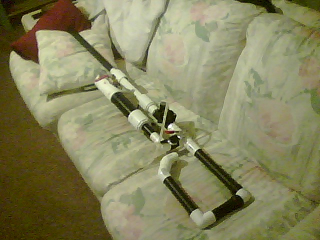Ill be putting up more pics of the gun and its damage when im done with it. Im not sure when this will be though -_- but i will also add a video or two to this post as well later on. For now here are six pics of the gun. And dont think its crap due to the discoloration and dirtyness of pipes and fittings. All pipe ends and fittings were properly primered and glued with PVC cement. Its all new PVC just the stickers are taken of and i have yet to scrap away the residue left behind.