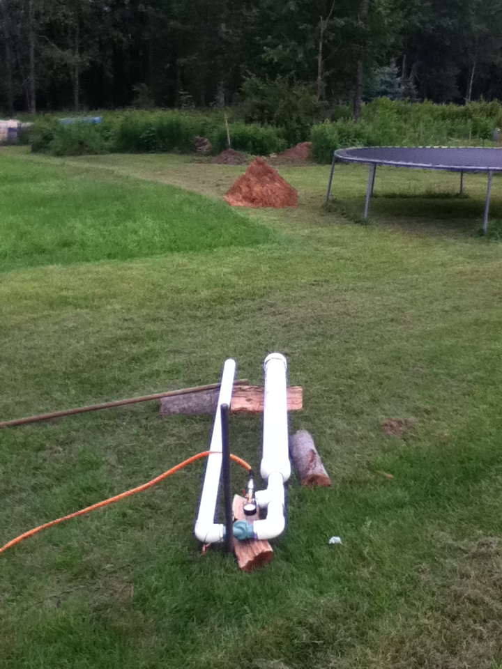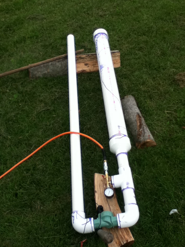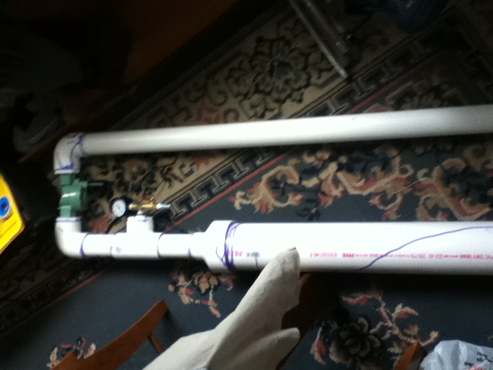 Well, this was my project last week, however I had been researching and interested in spud cannons for a long time. After a lot of research, I felt I wanted something that has a lot of power that runs by a source that is cheap: compressed air. So I went and built a full size cannon, with the barrel over top of the compression chamber, and the valve being a sprinkler valve, non-modified (using the electric solenoid.) I used SCH40 Pressure rated 4" and 2" PVC. 4' 4" Compression chamber. 5.5' 2" Barrel. 160psi pressure guage, and a quick connect fitting.
