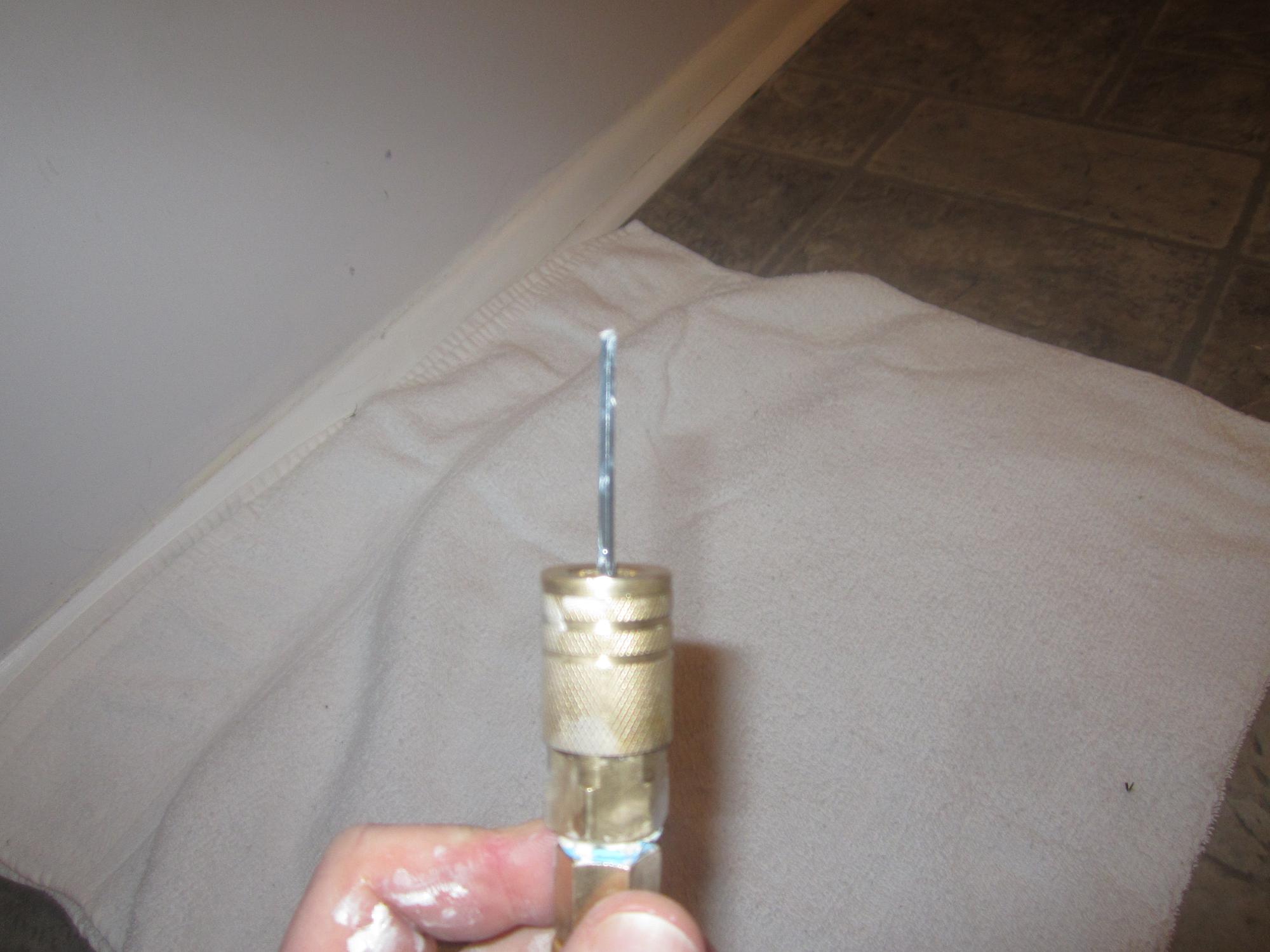 First find your suitable piece of skinny but strong metal rod. I used a cut off from a small allen key. Using a small bit of epoxy, glue your rod into the small depression at the bottom and inside of the female quick connect. Make sure it's centered so it can eventually pass through your entire set-up and press the pin on the schrader valve. When the epoxy is cured, begin work on the launcher side. Start by threading the 1/4 to 1/8 bushing into the male quick connect fitting. then. thread the schrader tip blowgun attachment into the 1/8th side of the bushing. Thats it! I am going to epoxy the schrader tipped attachment to the schrader valve on the gun, but for now I used lots of teflon tape, as the fitment isn't great between the two. The only issue is that the set-up disconnects so efficiently, you will be left with 3 or 400 psi in your pump hose. This is remedied by pressing your metal rod/quickconnect against something hard which vents the hose.