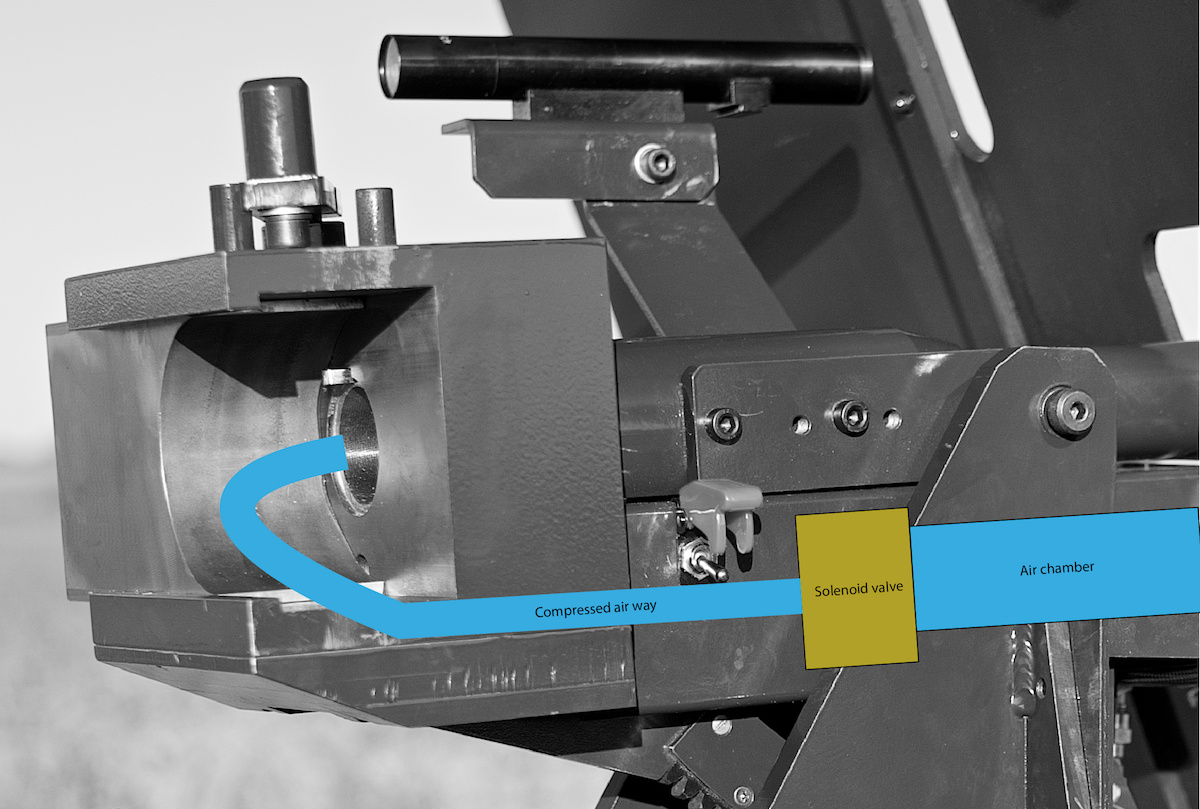 A cannon with breech assembly and a barrel weighting 45 kg. Steel air chamber and a solenoid valve. Operating pressure is 12-16 bar (can vary within these values in practise). Shot weight is negligible.