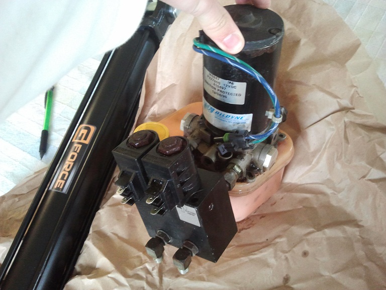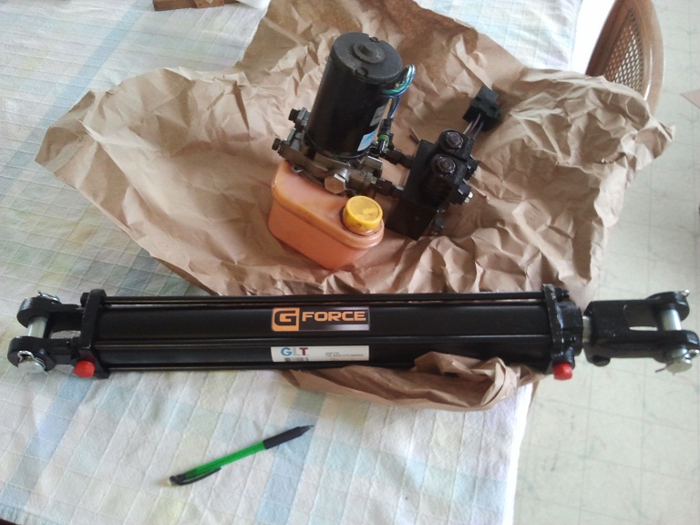 And my dad took that hydraulic cylinder for his trailer, so I bought a new 2"x16" cylinder and 12v pump with solenoid actuated valves, all of which is controlled through the console (talk about expensive).