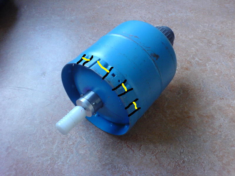 To prevent the welds from tearing holes in the tank or making weak spots, I cut the ring as shown. The black cuts were done first, followed by the yellow cuts. This left the welds on the tank without weakening the tank from stress. Then the tabs were filed down.