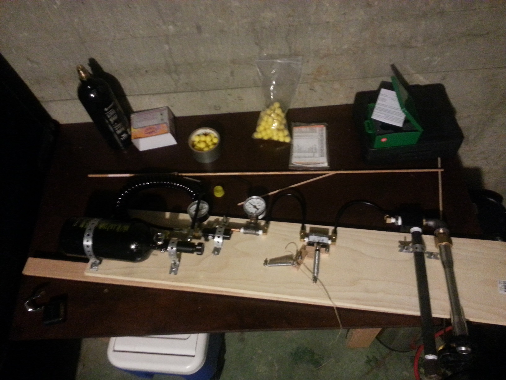 Before building an actual paintball marker, I've build a proof-of-concept test cannon. It uses all of the parts that the paintball marker will use, but mounts them in an easily accessible and exchangeable configuration.
