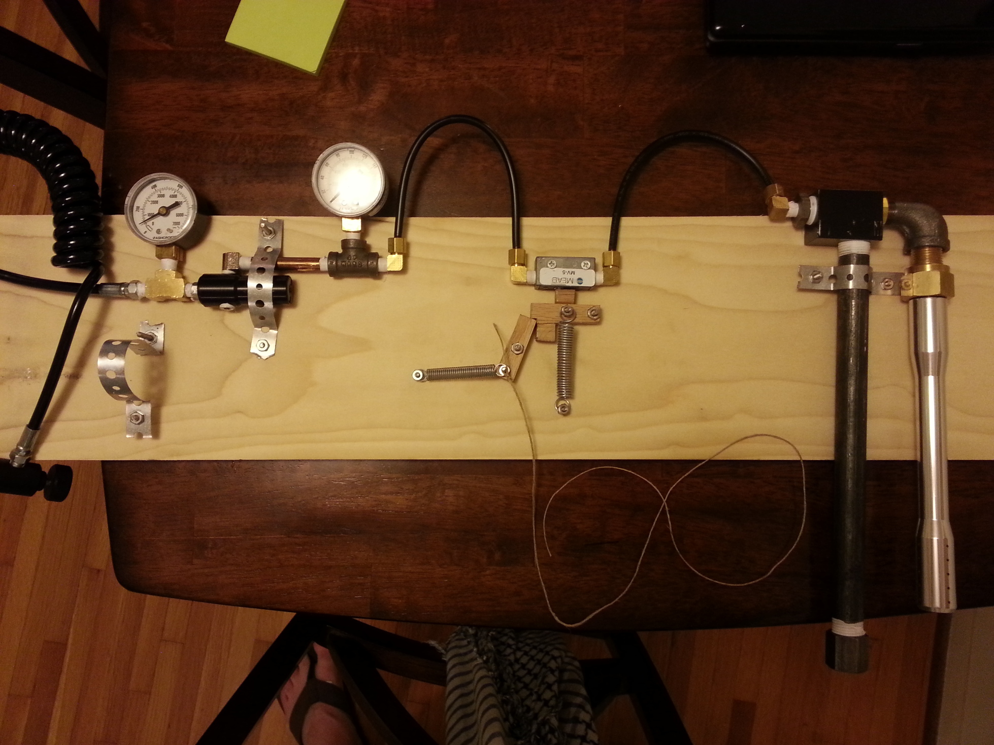 - HPA tank to a low pressure regulator (Palmers). Then to a 3-way, 2-position pilot valve (McMaster). Then to a QEV (the chinese black box QE-04). The exhaust of a QEV leads to a 7 inch barrel.