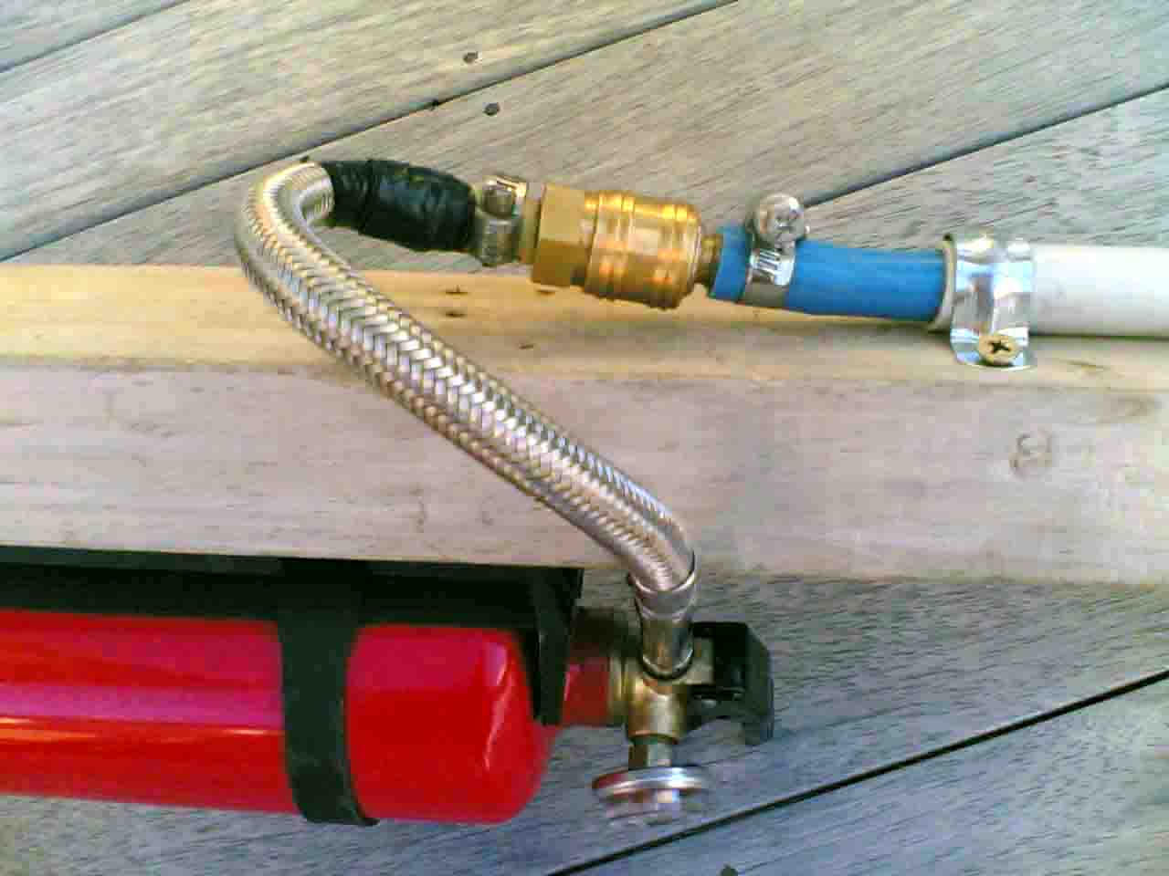 Since I didn't have the right tools to weld I decided to leave the valve on the fire extinguisher and use the gauge built into it. The flexible hose you see attached to the extinguisher is a... well I don't know what it is but I forced it into the extinguisher, no leaks even without plumbers tape. The barrel is electrical pipe, its not pressure rated but I have done tests on it to 150psi and it still holds strong.