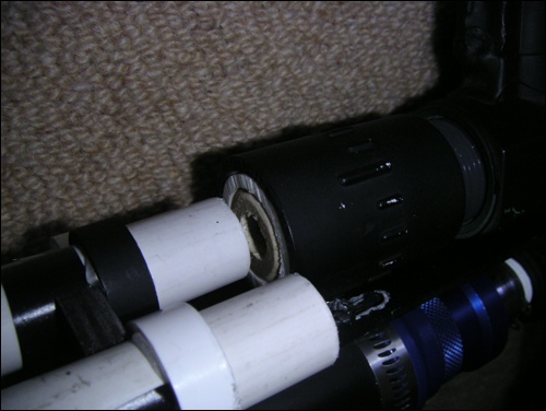 2. My next biggest problem was getting a some sort of good seal between the cartridge and the sprinkler valve. What I did was cut out a small piece of wood with a hole in it and sanded it down (took way too long) so that it fit inside 1" sch 40. So when the gun shoots the wood shoots forward and hits the cartridge and the air goes through the hole. Normally, the piece only has to move a tiny bit so not much air is wasted.
