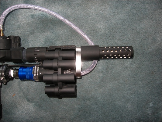 3. The last problem was the actual barrel. I made this barrel that looked way cool. I modeled it after the Ultimate Inline II by neospud. Later, I figured out that that since I didn't have a seal between the cartridge and the barrel that there was too much friction and it slowed the nerf way down or it didn't even make it out. After some hours of deep thought, I realized this with a certain amount of duh factor and I reluctantly took the barrel off. It doesn't look quite as cool but it's frickin' sweet.
