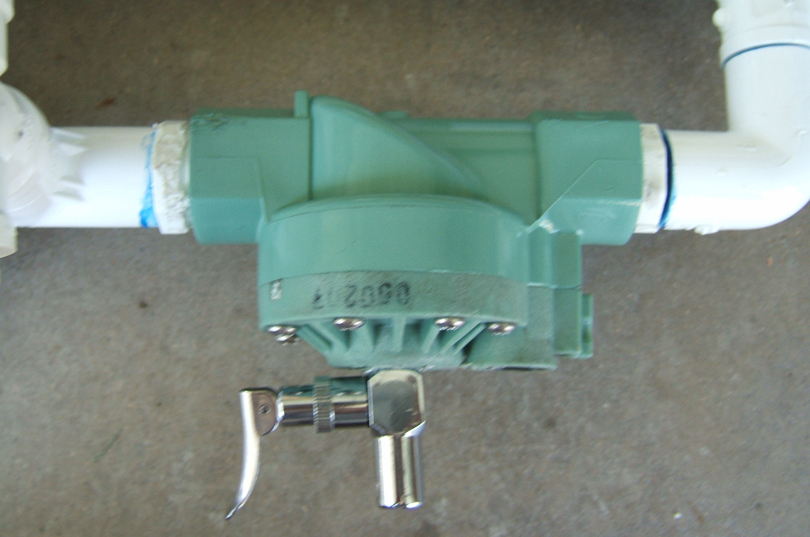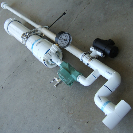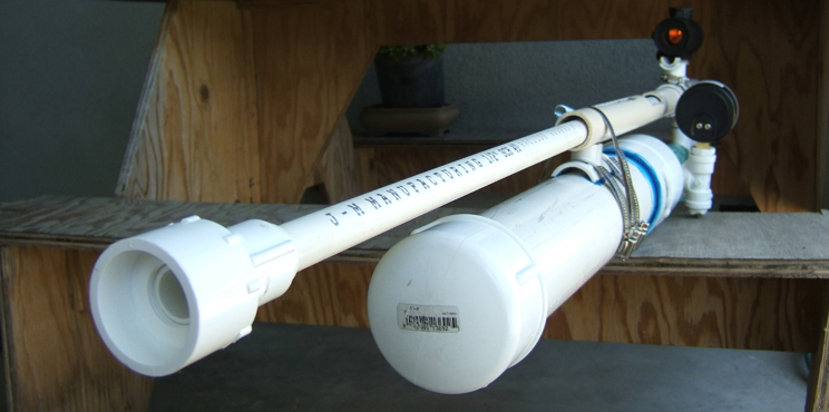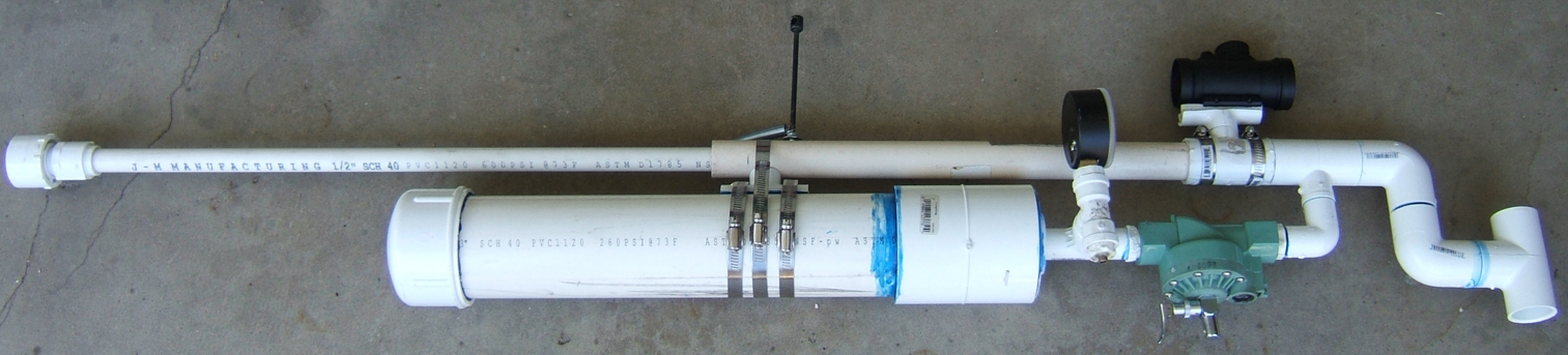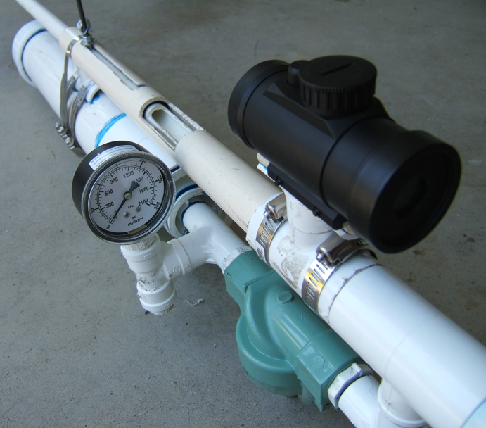 It is constructed using pressure rated PVC pipes and fittings, a modified sprinkler valve, and an airsoft red dot scope.