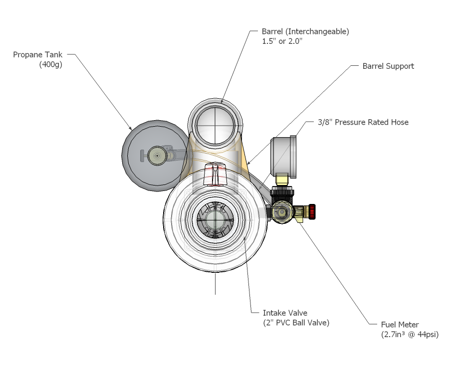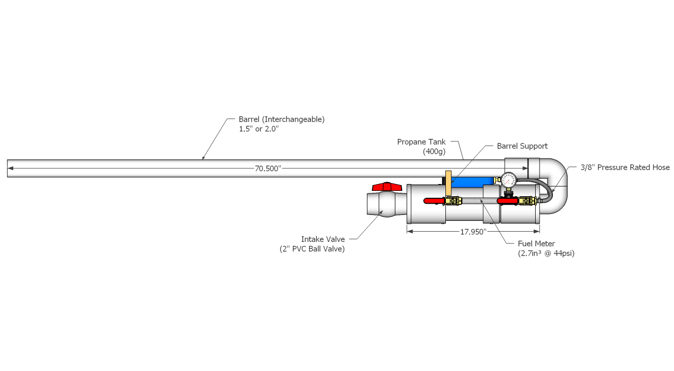 Also, if you haven't already, take a fluid volume measurement of your chamber and meter pipe. This will make it a whole lot easier when calculating the right amount of propane. Just cover the breech with tape or you could even plug the barrel with a potato to simulate a realistic shooting scenario. Then you can fill and empty the chamber from the ball valve. Remember to close the ball valve on the meter pipe where it meets the chamber. Take the meter pipe off the chamber when measuring its volume, It's much easier.