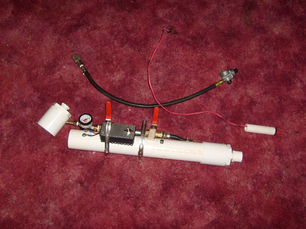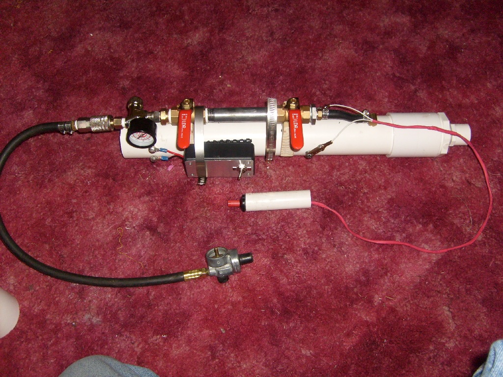 I've been playing around with it since my first post and it seems to fire on 2 meter pipes of propane into the chamber pretty consistently now only its pathetically weak. I do have major leakage around the sparker electrodes and the propane fitting going into the chamber, and most likely around the end cap and barrel threads also. I was using a burst disk from the plastic around a pack of cigarettes and it popped it a few times but it also ignited and slowly let the combustion pressure escape through the leaking areas a few times also.