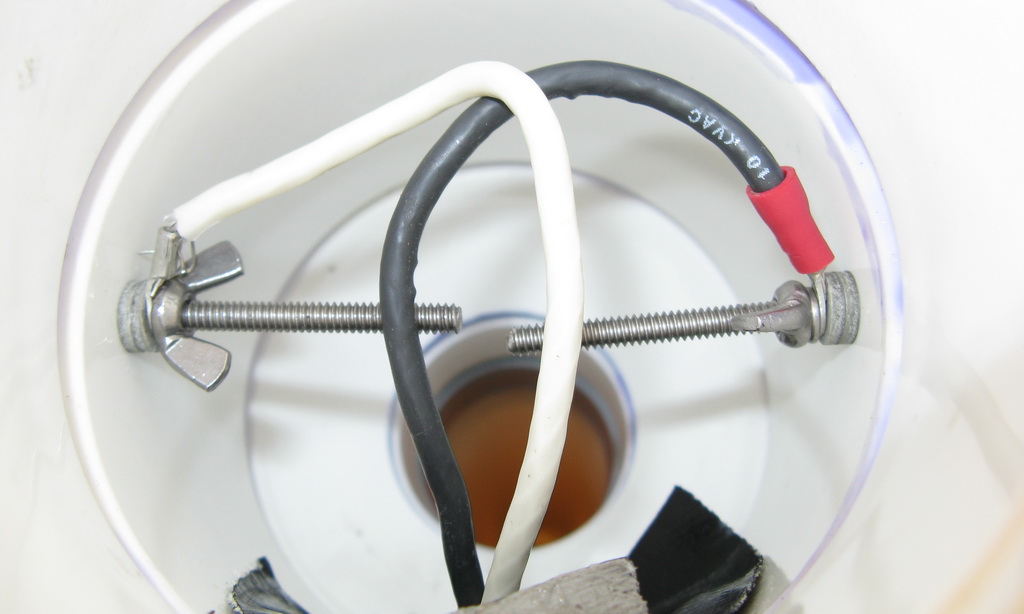 I then drill (7/64in) & tap (#6-32) two holes in my chamber, and find correct length of #6-32 stainless steel screws for the gap. Use a #6-32 locking washer & wing nut to secure the BBQ wires to the screws inside the chamber. I finish it up with screw covers.
