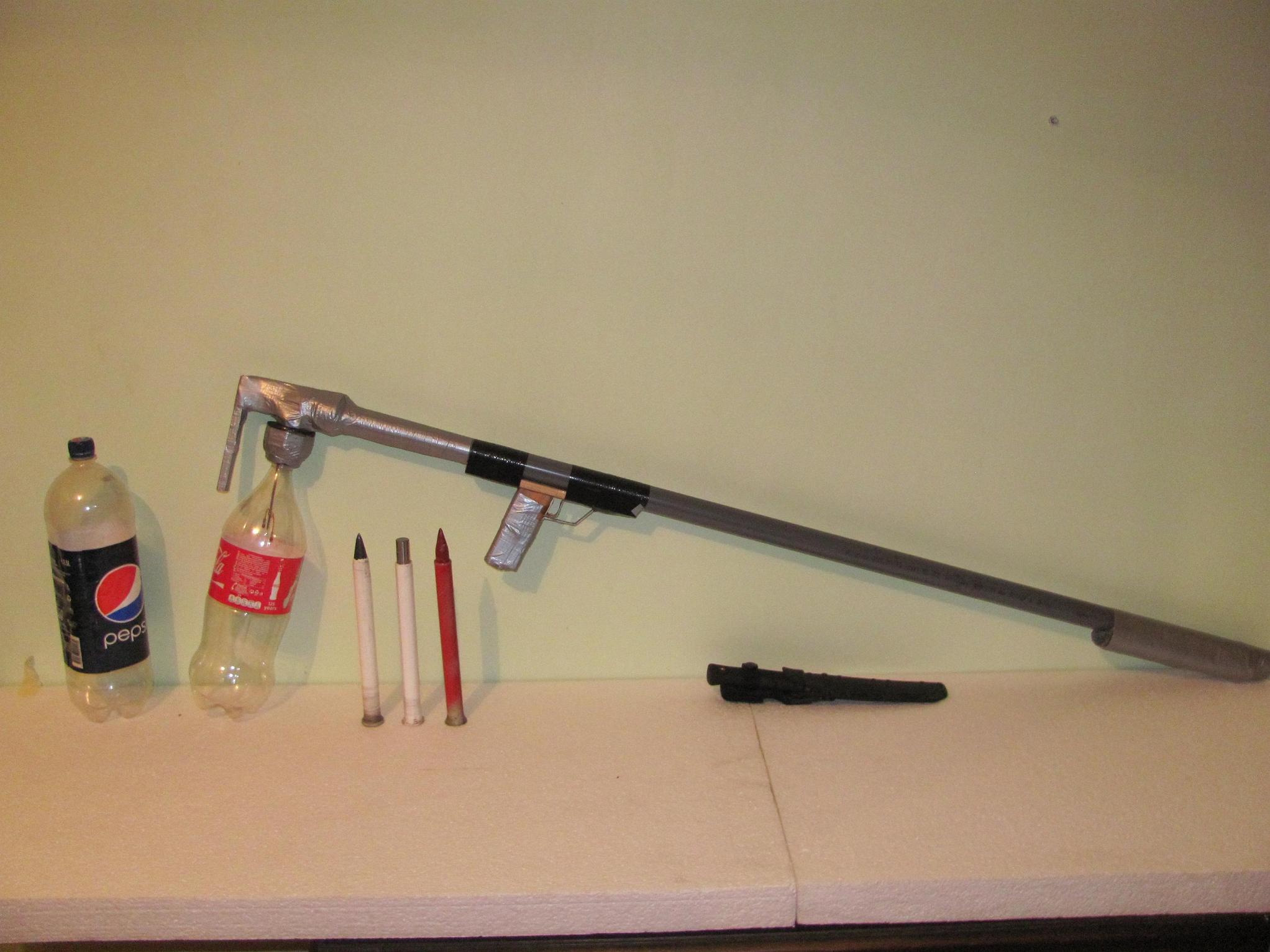 Here's my new special zombie survival spudgun. It fires 20mm polypropylene projectiles with a steel penetrator. The barrel is 28mm inner diameter so the projectiles are with a little increased diameter at the one end. The fuel is in pre-loaded 2l coke bottles(two under my bed and 3 over the wardrobe) and is H2:N2O 1:1 or Methanol and N2O. The ignition is with two professional pyrotechnic ignitors powered by two AA alkaline batteries. The trigger is two well sanded copper plates with a plastic safety witch goes to the one side to disengage. The barrel is ported. Allowing the pressure to drop before the projectile leaves the barrel makes every shot ridiculously accurate. The gases pass trough steel wool witch cools them and adds a little sound suppressing effect. It may look a little ghetto but I'm on a budget here and the tape isn't holding anything critical. I couldn't make a video with it but here's a link with an equivelent gun (that one is a prototype with lighter piezo ignition, no glue used to hold the cut off bottle cap in the gun but still no fail of anykind)