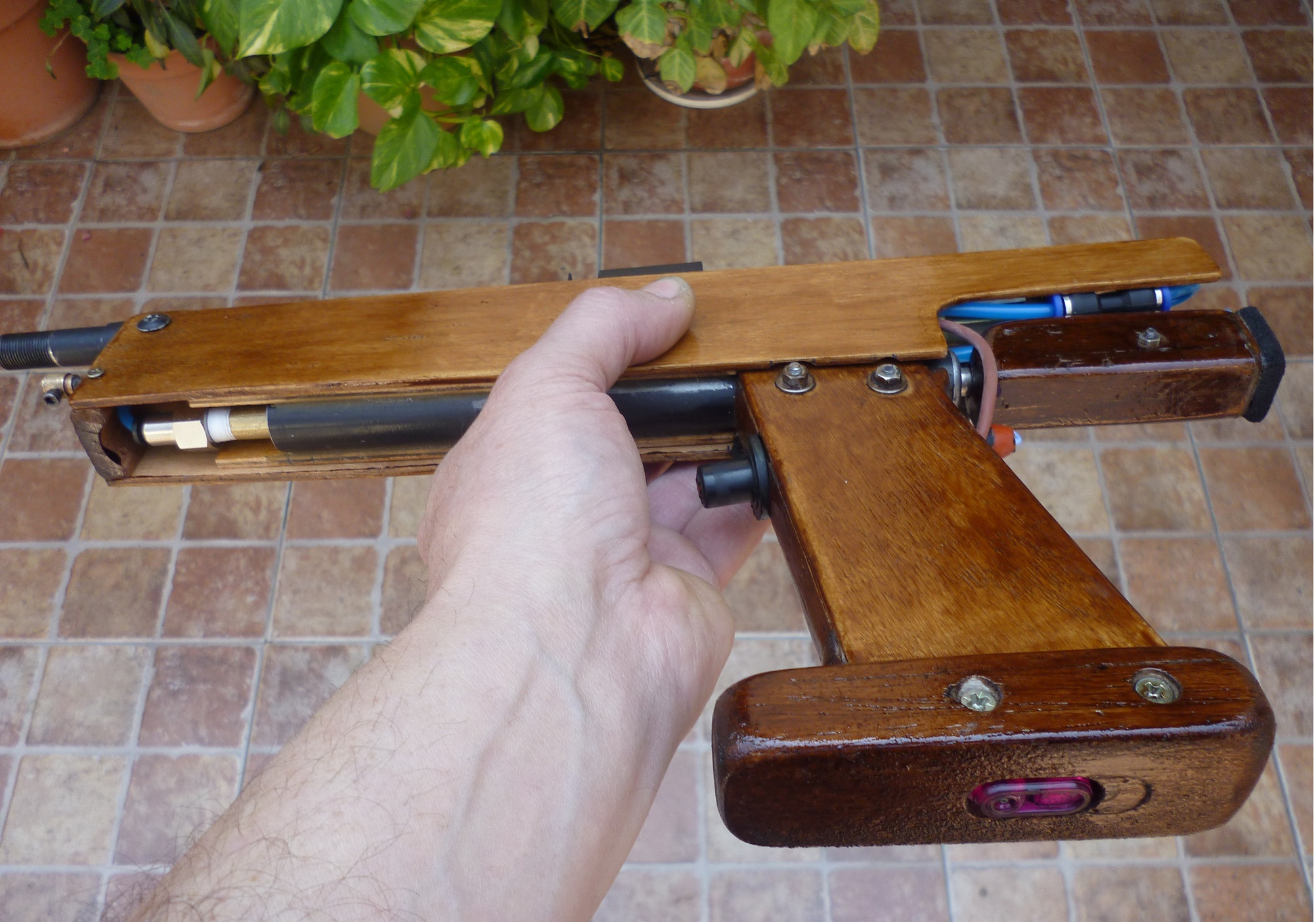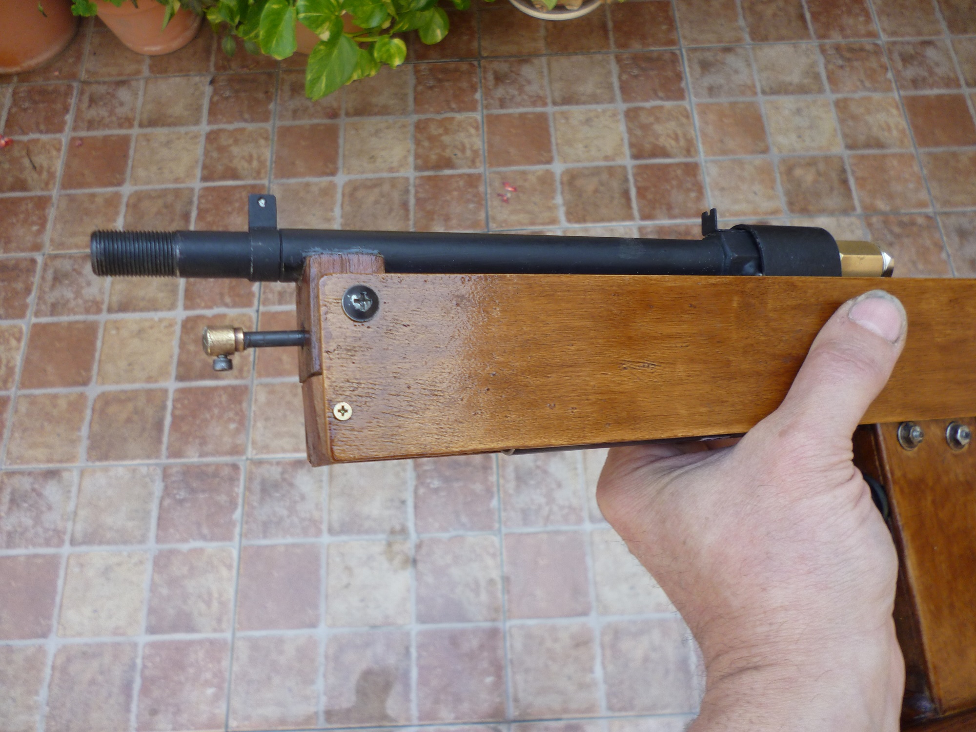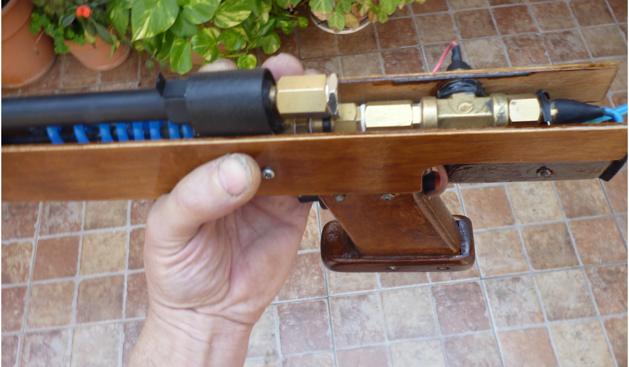 My new self-made short gun. It is a hybrid pistol, with a built-in air pump, that operates with 8x and five strokes only. It shoots common pellets, .22, and the firing barrel is 12 micro-ridged, 200mm long. My friend's chrono gave about 650 fps on 4.5 ml of butane. It weighs about 900 grams, and retention of the mixture under pressure is achieved with my "captive ball" valve, which works like a rupture disc but does not need to be changed every time it is triggered. The change occurs every 150 to 200 shots. This simple valve is adjustable to regulate the pressure at which the steel ball escapes when combustion occurs.