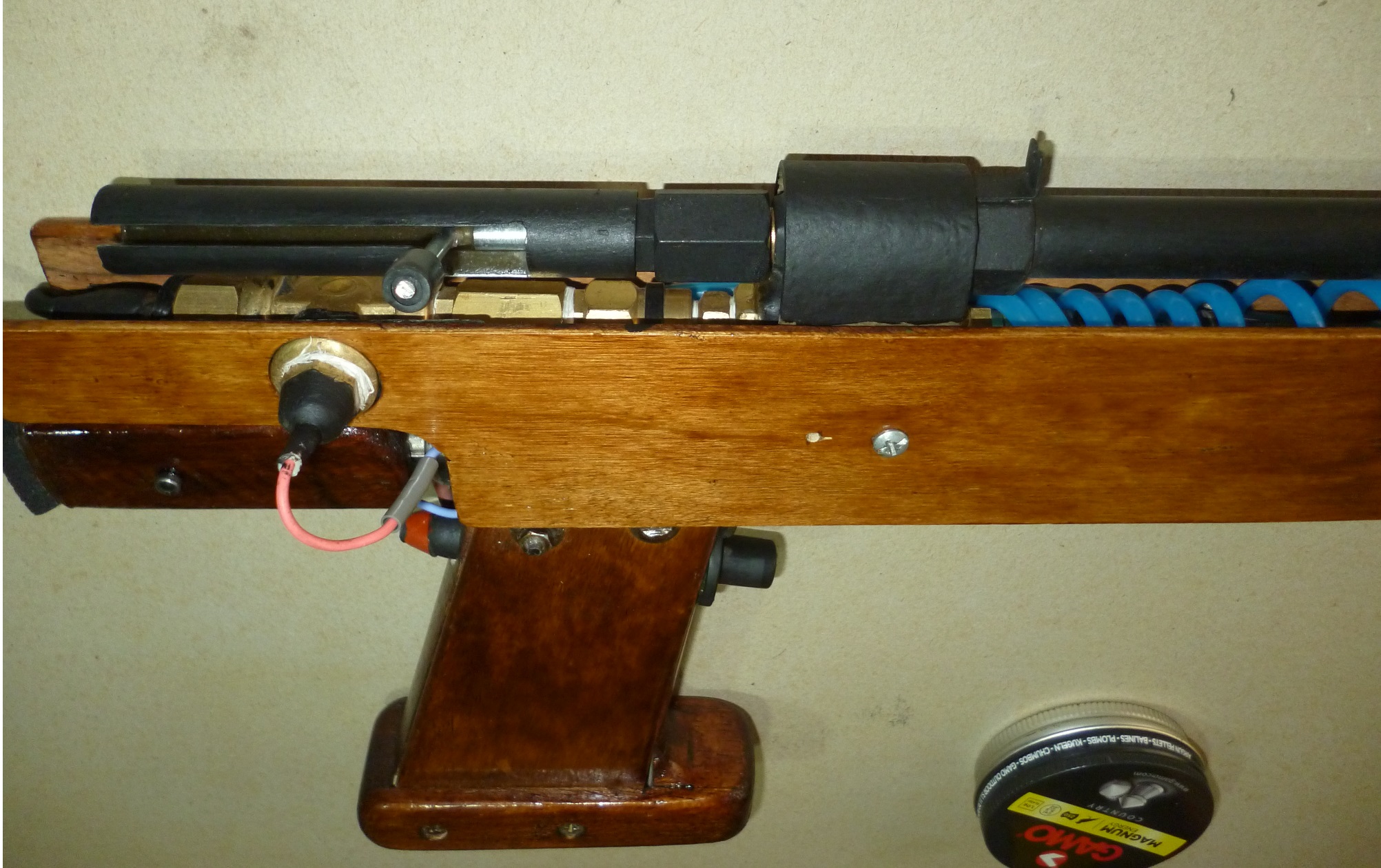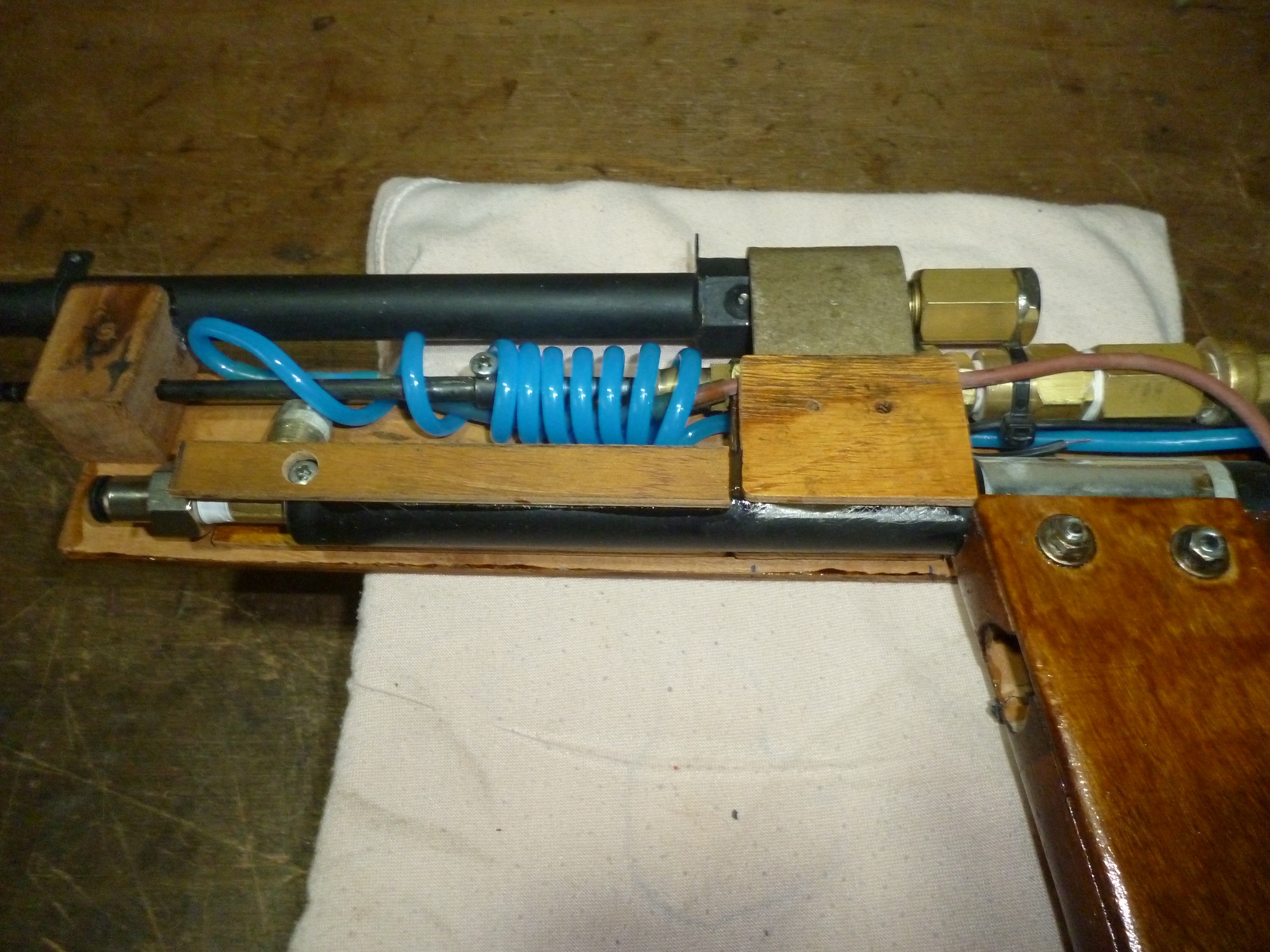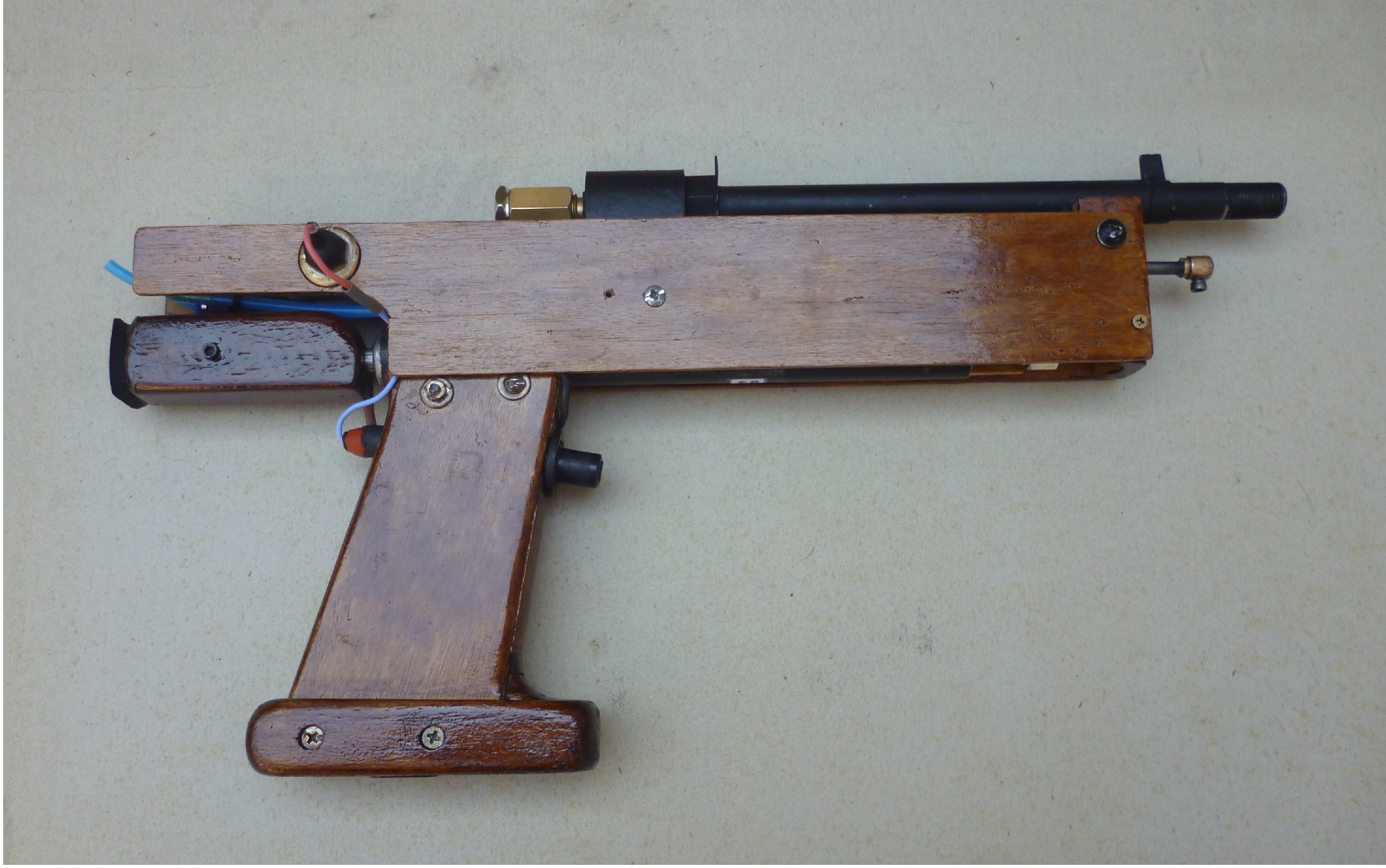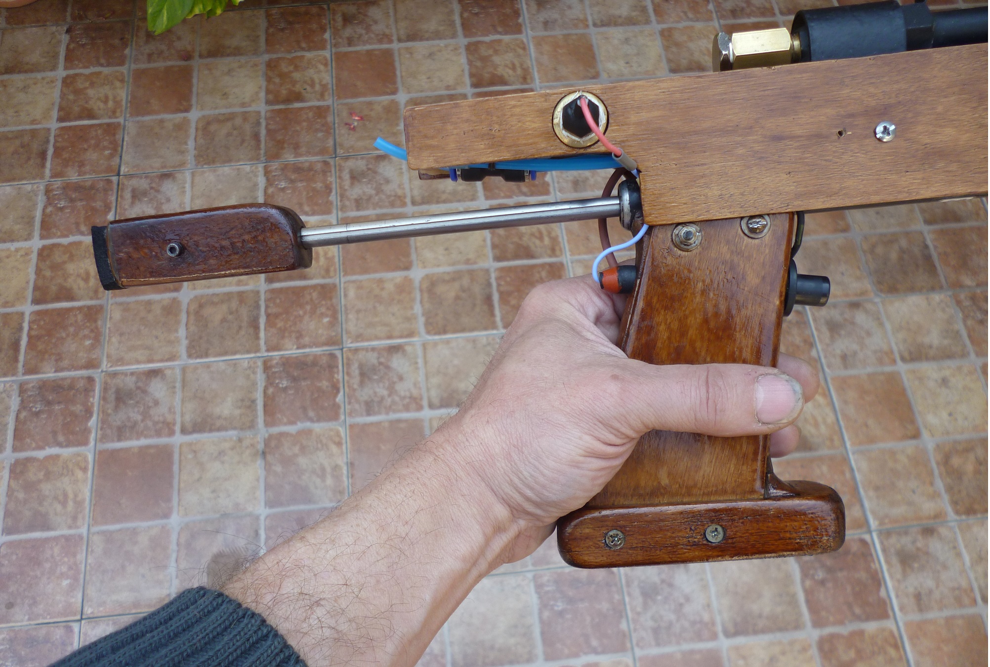 My new self-made short gun. It is a hybrid pistol, with a built-in air pump, that operates with 8x and five strokes only. It shoots common pellets, .22, and the firing barrel is 12 micro-ridged, 200mm long. My friend's chrono gave about 650 fps on 4.5 ml of butane. It weighs about 900 grams, and retention of the mixture under pressure is achieved with my "captive ball" valve, which works like a rupture disc but does not need to be changed every time it is triggered. The change occurs every 150 to 200 shots. This simple valve is adjustable to regulate the pressure at which the steel ball escapes when combustion occurs.
