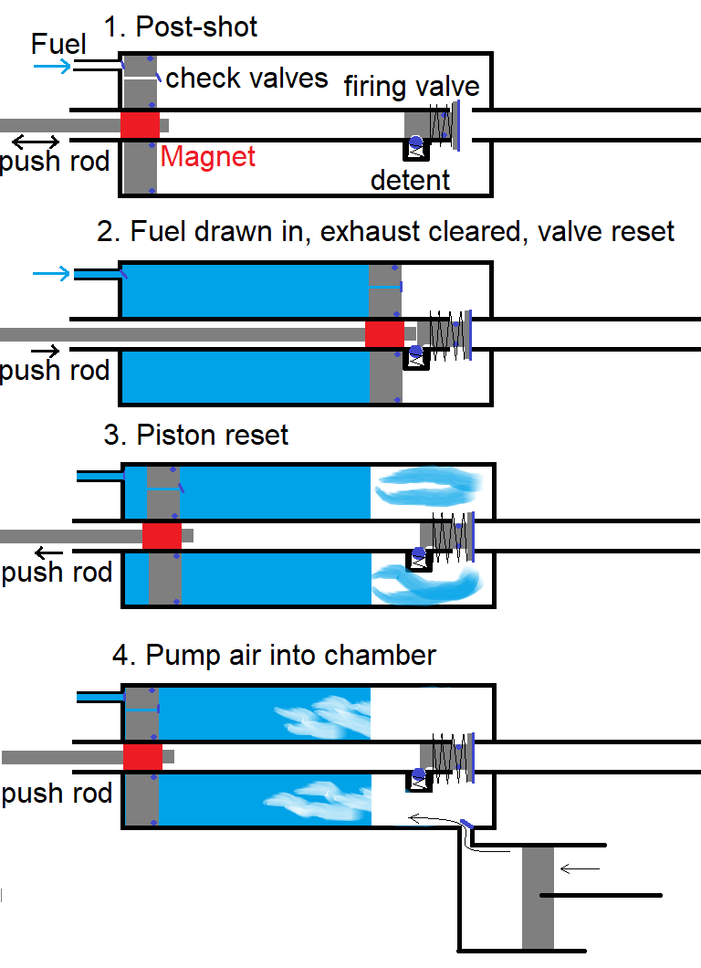 When the gun fires, the firing valve piston gets trapped by the detent, so it stays open post-shot. Then, the push rod is pushed forward, drawing in fuel through the check valve from a near-atmospheric-pressure fuel reservoir (eg, syringe or balloon). At the end of the stroke, the push rod releases the firing valve from the detent, closing it. Then the push rod is withdrawn, and the fuel flows through the check valve in the fuel/exhaust piston and occupies the chamber. Finally, the pump pressurizes the chamber with air.