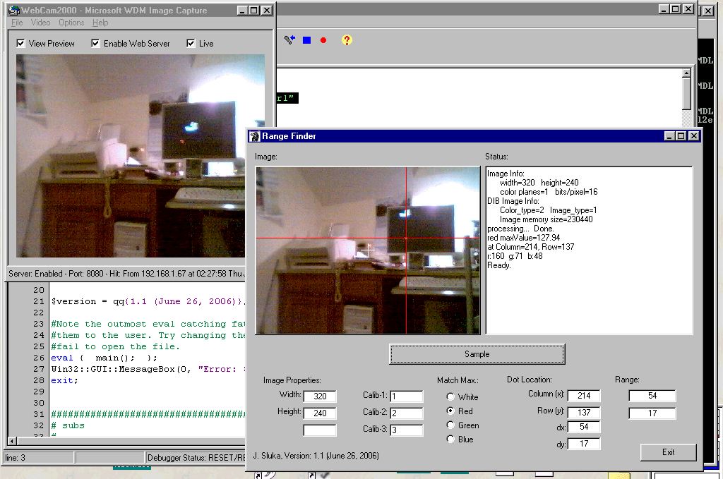 Below is a shot of my desktop with an app running that I wrote a few years back. The crappy image in the upper left is from my $20 web cam and the window is the web served version of the cameras output. The bottom right is a perl app that is getting the image from the server, finding the red dot (from a small laser pointer) that is on the computer screen and highlighting that red dot with the red cross hairs. The app has various info like where the dot is in the image etc. (The computer shown is not the one I use, it's across the room from mine. The image was taken at night and the dim room light + crappy web cam = really crappy image.)