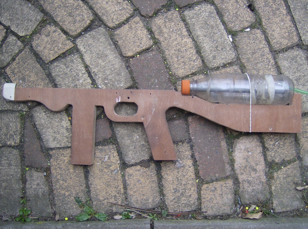 In this gun the bottle and the valve are inline with the barrel. This makes it hard to aim, but gives you a very simpel and working airgun. It shoots around 250-300ft/s. In this case the barrel is the hammer again (like in my other project, but in this case the valve is inside the pressure bottle which makes an easy seal.