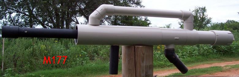 aluminum vortex block "inline". shoots .177 cal metal bb's. i have a couple more things to do to it before its finished. i also want to make a detatchable 1 1/2" m203 spud launcher for it. maybe a scope. I used a metal rifled barrel from an old pump up bb gun i had.