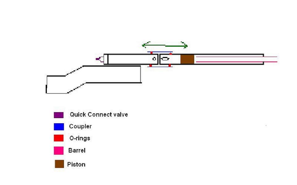 I was thinking one day, and I came up with this semi-auto paintball gun design. It is largely based off of Clide's slider gun. When the coupler is in it's "rest" position (covering the holes on both pipes, it is held there with a spring), The chamber is filled up, sealing the piston agains the barrel. When it is pulled back, the chamber hole is opened, venting the pilot and sucking the piston back, firing the gun. Then the coupler is released, allowing the chamber to fill again.