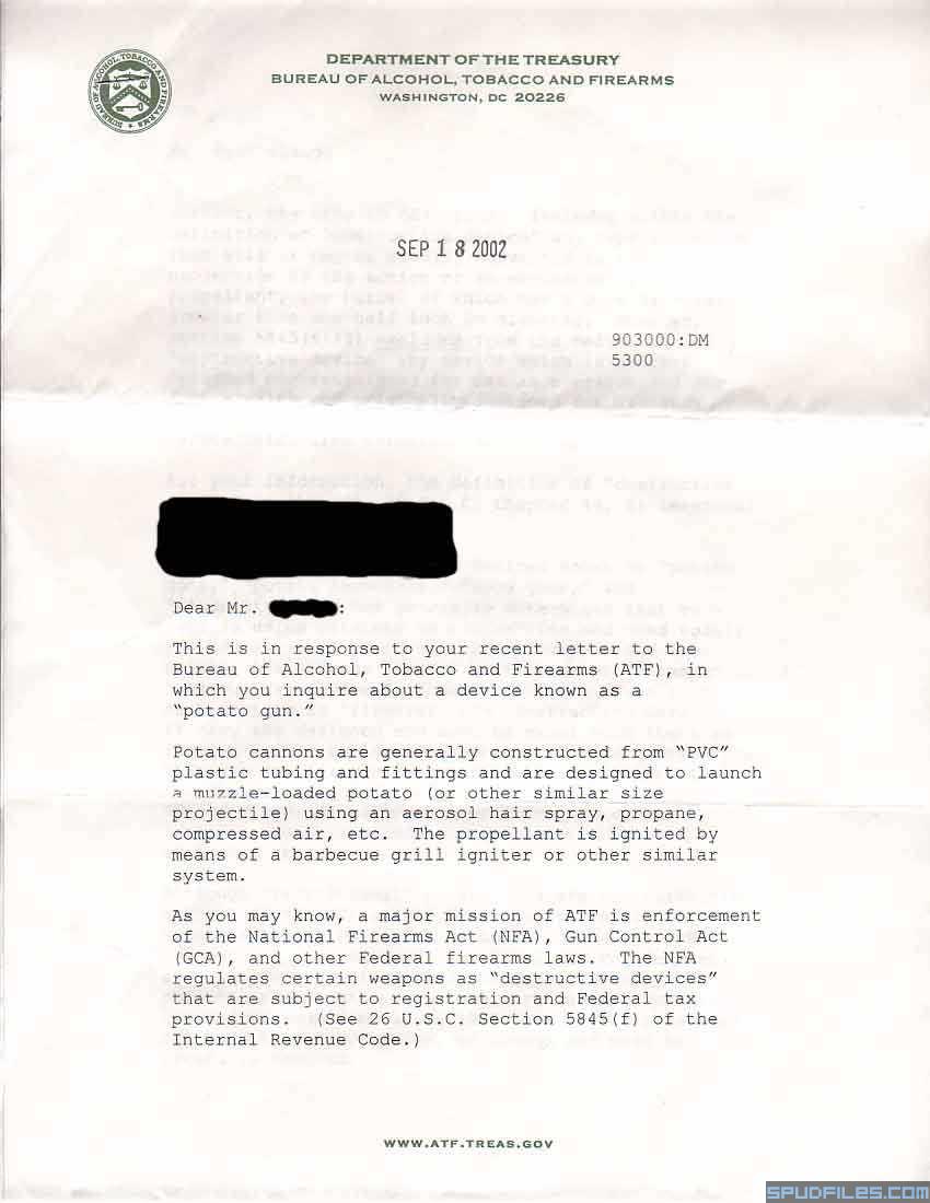 Here are the 3 pages that came back when Andeh's friend wrote to the United States government about "Spud Cannons"