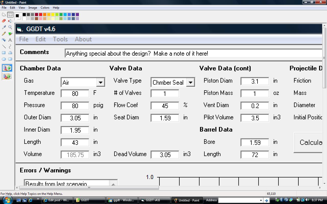 That's yours. GGDT tells me I get 955 feet per second at 156.3 ft/lbs. From a 5g projectile.. And then if I use hydrogen, 1449 feet per second at 360 ft/lbs.. Ahh, 400 psi with a super efficient piston valve ported b a 1/2" QEV..what Won't you do? ( next gun)FORE!!!! wrote:is that what ur guns projectiles travel at? or is that what mine does?inonickname wrote:It's very optimistic. I'll model it for you..