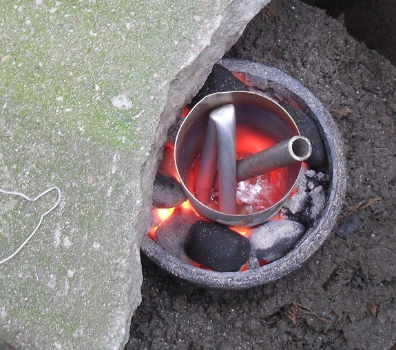 After about an hour I discovered that I needed to put charcoal underneath the crusible aswell...anyway...I took just 2 pictures when the actual melting had begun...I pured some in a pipe..wich failed to give me solid roundbar...the rest became a nice blob looking thing...