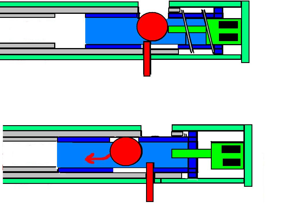 - THe "blockerbolt" is fixed to the tube in wich the blow forward bolt slides.In other words; it doesn't move, only the blow forward bolt does.It runs through a slot in the bottom.As the bolt is moved forward the marbles roll off the blocker and drops in line with the barrel to be fired.The hole in the top of the B.F., bolt provides the nessecary space for this action to work.The blocker also inhibits the blow forward bolt from turning, wich would mis aline the "drop-in"hole at the top of the B.F. bolt.