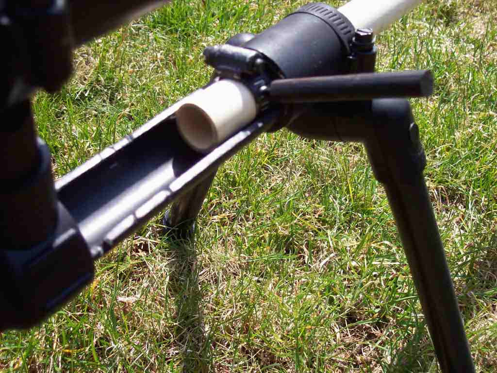 Hey, im finally finished with this gun. It works quite well and is very ergonomic. Most of it is pretty self explanitory. The schrader valve setup is all threaded- no epoxy! The stock was designed w/ safety in mind so its mostly 2 layered with both pipe and slip over it. The valve is a 1" watermaster piloted by a .25"ball valve. I like the scope, its slightly impractical, but i still do use it and it does help, it's also easily removable. The barrel is 3/4" cpvc that slides through 1" and is pressed into the neoprene washer behind it when sealed- making it breech loading (not fully my design tho.) I do get some pretty good shots out this gun. Its good with baby carrots, paintballs, or small tabasco bottles. I can also easily remove the barrel and scope and put on either a marble rifle or a 1.5" potato/ ping pong ball one. It also has a foldable bipod, and lense caps for the scope. The only improvement id like to make is to give it a .25" qev in place of the 90 deg elbow. Id still keep the ball valve, but, this would just give me a bit more oomph and much more consistent shots. ask questions if you like.