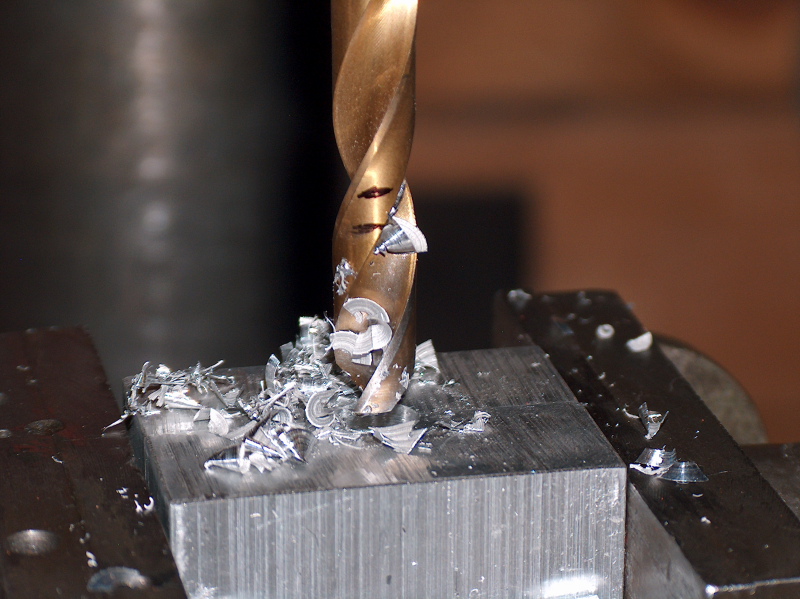 Now we need to CAREFULLY line the blocks up and secure them in the vise. One on top of the other. Drill through both blocks as shown so that they can be bolted together. Use WD-40 as cutting fluid. Keep the bit and the end of the hole wet.
