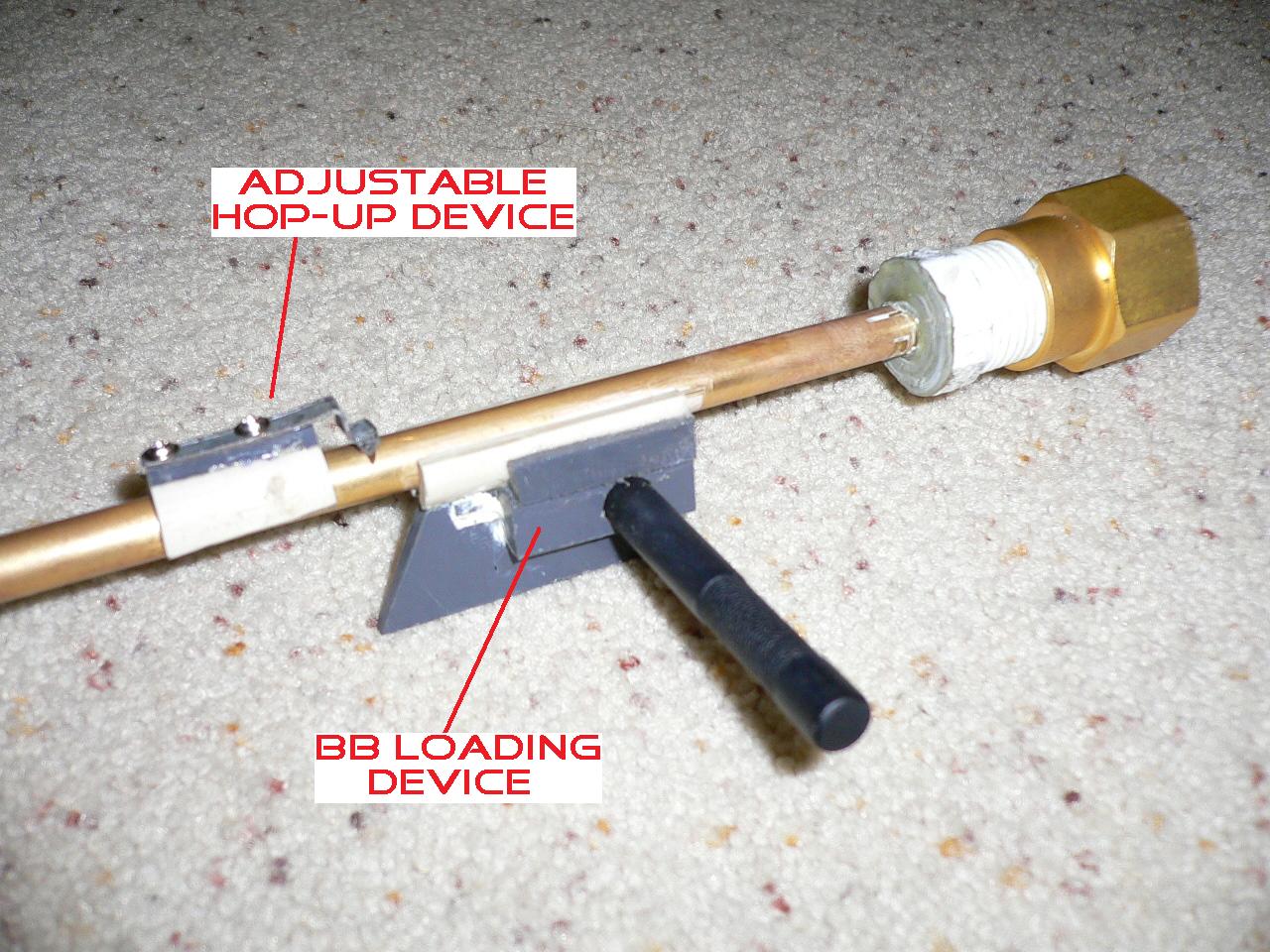 Davidvaini: I'm not sure if you thought that i have just a regular airsoft magazine, but anyways, I made that magazine from scratch out of 1/4" sheet pvc to work with my loading mechanism. Also, this gun was originally designed to take CO2 from a tire inflator at the rear of the gun and the fill lever was right where I layed my cheekbone so I could just push down my face against it to fill for the next shot, but I found that I was a little annoyed by replacing the 12grams so often so I just switched my plumbing out to propane and now it just fills automatically, all I do is pull the bolt action back and forward and shoot again and again, with waaaaaaay more shots per can. Hop-up works so awesome! I love how it also works as an anti-roll so the bb's don't roll out of the muzzle, I can shoot this gun at all angles. Haven't tested max effective range yet because I've been limited to shooting along the outside of my house right now, but so far it's been at least 80 feet (which puts marks in my wood fence what looks to be the penetration of about 1/4 of a bb). Oh ya also I made the muzzle brake out of 1/8" sheet pvc for the top and bottom (heat-curved by hand!) peices , and 1/4" sheet pvc for all four sides for more strength.