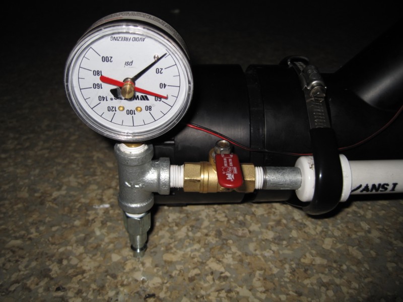The fuel is propane, through a metering system made out of 1/4" galvanized fittings, 1/2" PVC, and some black acrylic tubing. I made a long hose coming from the propane tank, which ends in a compressor fitting for easy removal, so I can leave the tank on the ground. The pressure gauge is upside down at the moment, and I intend to get a different one as soon as I have the cash. I also used tubing to go from the second valve into the chamber, in lieu of using an elbow fitting. If anything goes wrong it is easier to disassemble this way.