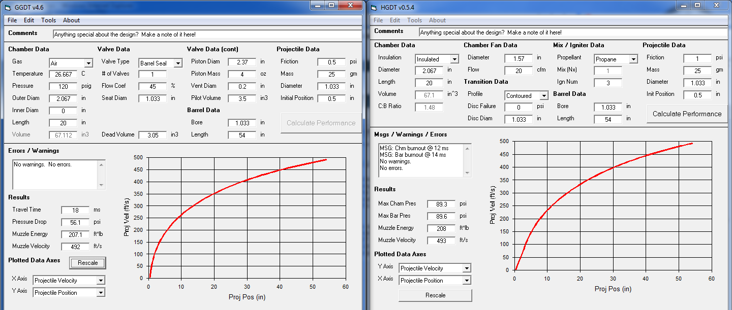 Anyway, I started wondering how a similarly constructed combustion would compare to my pneumatic as far as performance. So, out of curiosity, I did a quick estimated comparison using HGDT and GGDT. I figured the pneumatic would cream the combustion @ 120 psi (barrel sealing piston valve), but I was wrong. The muzzle velocities turned out to be about the same. I used 120 psi as a reference since my gun is made from PVC and that probably about the max pressure I consider safe.