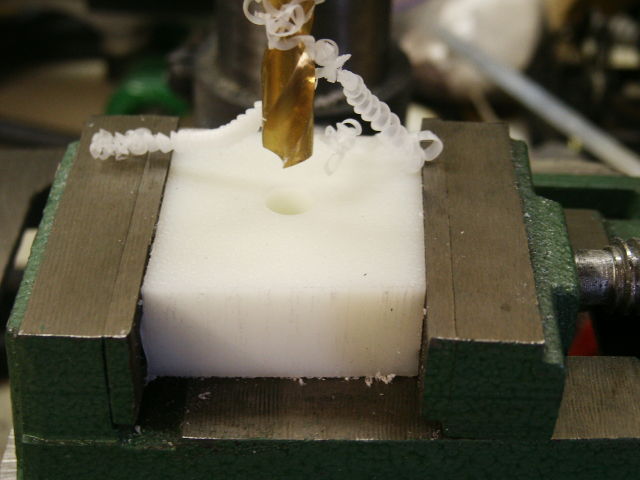 A hole is drilled into the back of the piston for a support bolt to become an arbor for the drill press. The hole does not go all the way through the piston.