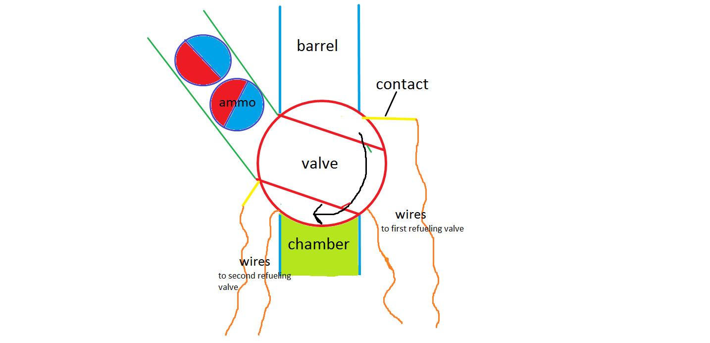 That sounds great and give me another idea I will oversize it to be barrel size and add a shotgun magazine extension to the side it so when the valve closes it chambers a round to be rotated and be ready to shoot when the valve opens again. Then I will change the contact to release the first valve on the refueling line and when the valve closes by spring it the second valve on the fuel line releasing the fuel and compressed air into the chamber.