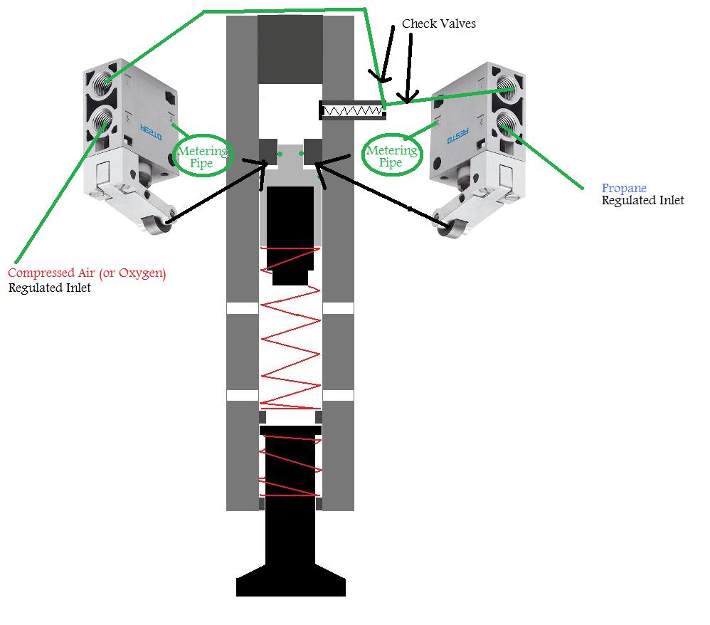Now it gets difficult :?. The layout I have pictured should work for fueling and returning the piston. A series of spool valves are connected to the chisel so that when the tool is lifted up, fuel fills the meter pipe, and the piston is pushed to the top of the tube. When the tool is set down, air flows through the fuel meter pipe, pushing fuel then air into the chamber. Spark, bang, repeat.