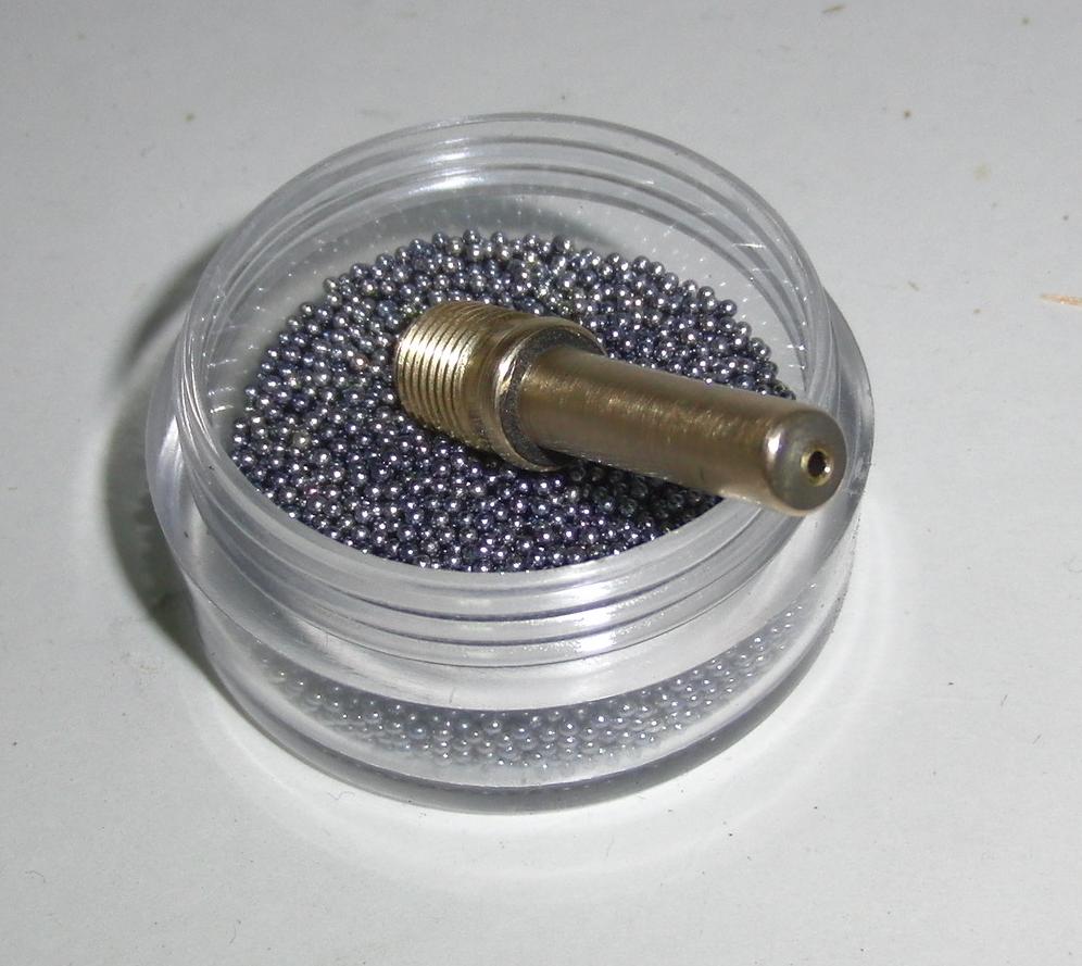 Barrel is a 10mm long 1mm calibre length of brass tube, naturally power is laughable at best, a steel BB will ricochet off a sheet of paper - but it works
