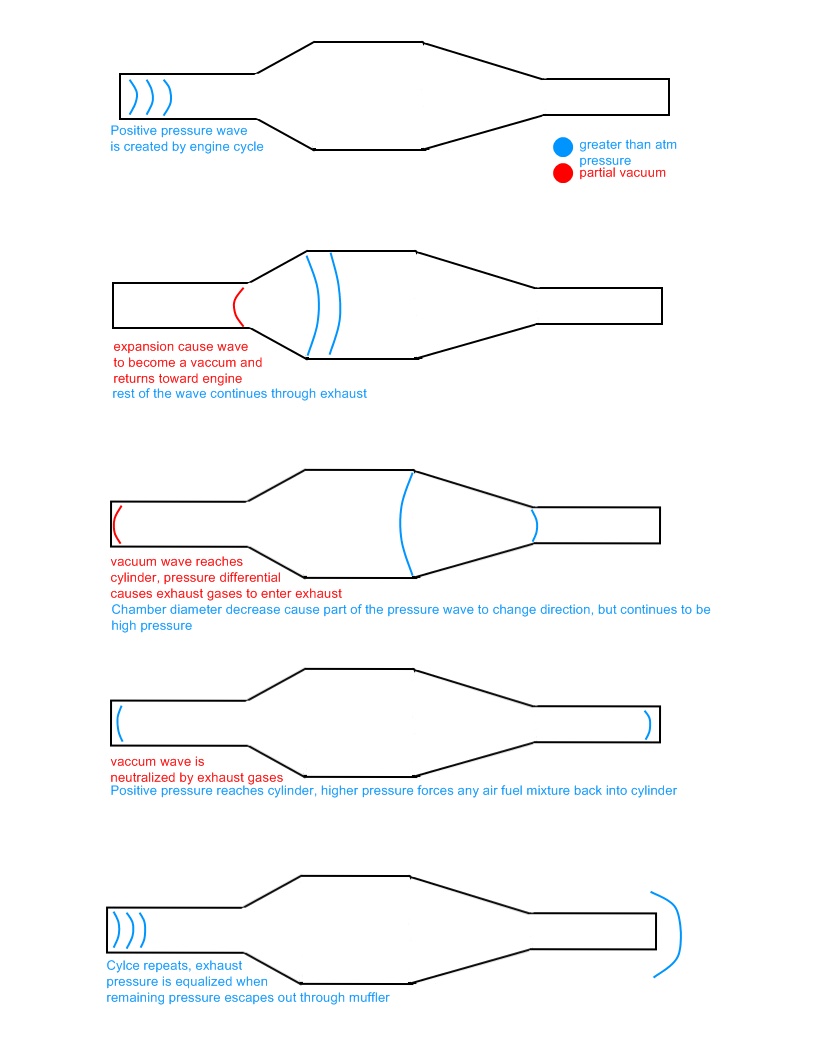 While this is all fascinating for a 2 stroke engineer, the main part that I found could be usefull in spudgunning is the fact that when the high pressure waves goes from a small diameter to a large diameter, it creates a low pressure wave that travels back toward the small diameter.