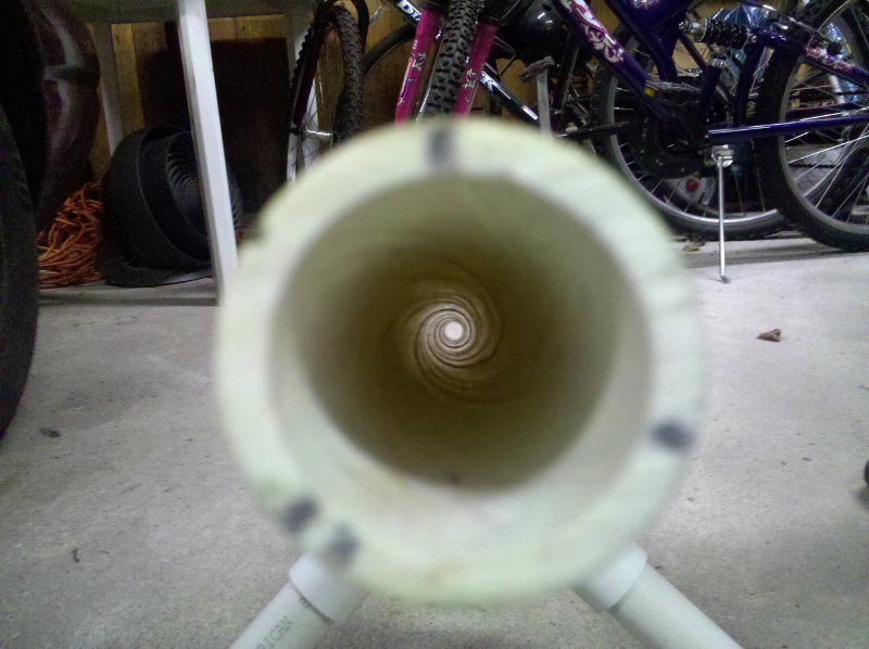 This pneumatic rifle uses a 2" piston valve actuated by a 1/4" ball valve as a firing mechanism. The piston itself is made from a 1.5" PVC cap filled with epoxy with the rubber sealing face sitting inside. Sidewalk chalk and wooden dowels are the primary ammo. The gun was finished in July of 2008 and has since been upgraded to add the scope, muzzle break, and rifled barrel.