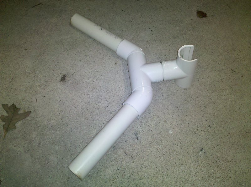 This pneumatic rifle uses a 2" piston valve actuated by a 1/4" ball valve as a firing mechanism. The piston itself is made from a 1.5" PVC cap filled with epoxy with the rubber sealing face sitting inside. Sidewalk chalk and wooden dowels are the primary ammo. The gun was finished in July of 2008 and has since been upgraded to add the scope, muzzle break, and rifled barrel.