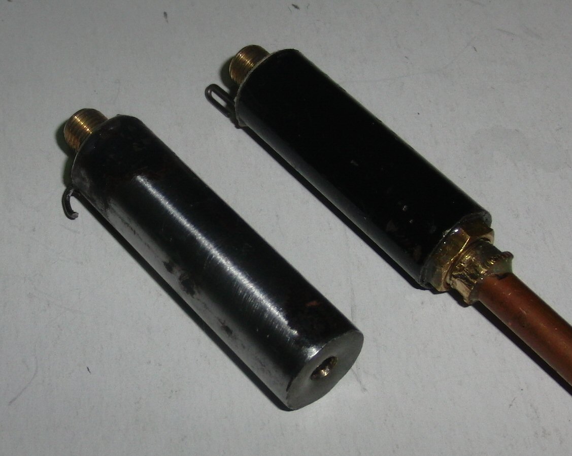 - fill rig (basically a sealed chamber with a schrader valve and threaded fitting) that will enable me to fill cartridges without having a schrader on the cartridge itself, possibly using the projectile itself as a "one-way valve" as discussed earlier in this thread. The latter setup (including cartridge) is illustrated below: