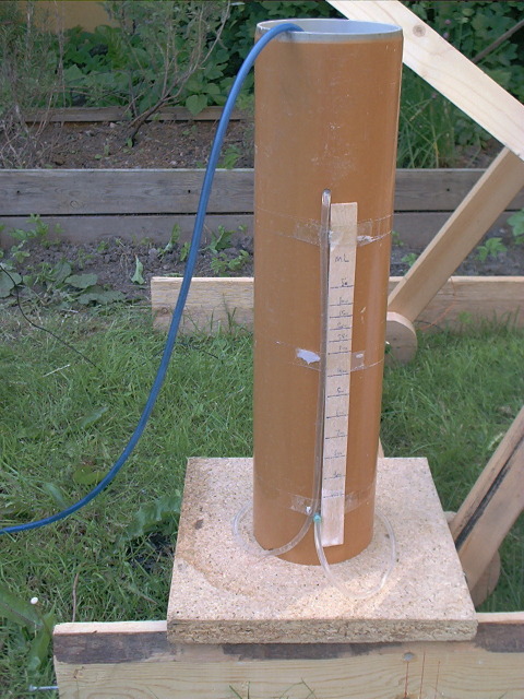 Gas meter device. It is basically a bottle with a hole in the bottom and a hose through the cap, immersed in water.