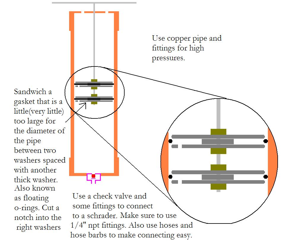 The pump design is something like this. I don't have any CAD programs so Paint will have to do. I suggest using thick(1/4''?) o-rings to optimize the seal and minimize the chance of o-ring failure. Most hardware stores sell 1/4'' NPT hoses with the fitting already attached. It may be tough, but find a thread-on Schrader coupling for 1/4''.