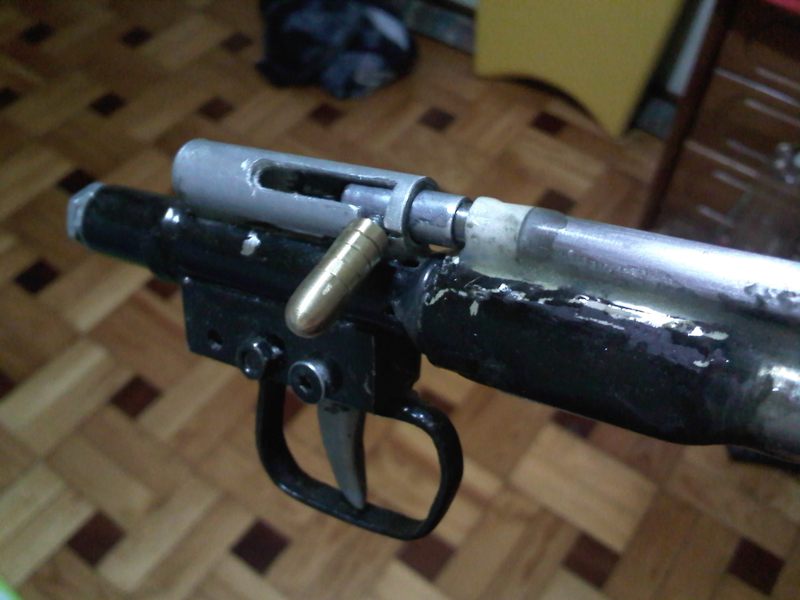 As most of you knows, I found a way to build a simple hammer valve using a blowgun. So I used the valve I showed here: http://www.spudfiles.com/forums/hammer- ... 23202.html to make a simple pcp gun, just to see the power, and at 400 psi it´s very decent with a pellet, pretty good compare to commercial pellet guns :P . The chamber isn´t big, so I can charge it with my shock pump. I also combined the recock with reload, but I didn´t put a magazine on it, maybe later I will add a revolver style magazine.
