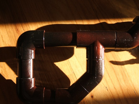 I believe this sucker is my best looking gun so far. The barrel is exactly 1 yard with the suppressor attached. The paintjob is pretty cool, black with red accents. The trigger has a ball valve safety on it. I might make a bi-pod for it, because it will look cooler and the suppressor weighs about 4 times as much as the whole barrel and it makes the barrel bend down. The stock is plugged with a piece of 3/16" thick rubber with sealant around it. Anyway,