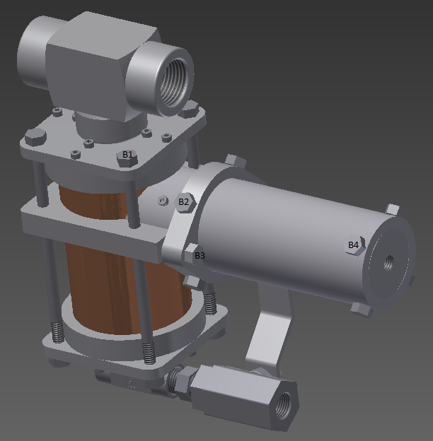 -The main bolts (labeled as B1) are currently 1/4”, which together have three times the tensile strength than the load from 1000psi. However, I'm not sure how the impact of the piston over time would affect them, or how the tightening down of their nuts would.