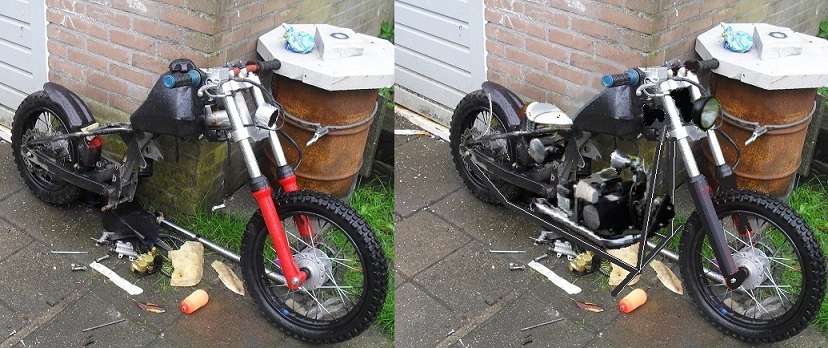 I just plan on making it ridable for now. I plan on enlisting so I won't have time to put much more into it, but when I come back I plan on making my own tank and other parts. I also don't have the required tools yet, and there's no sense in having them sit there for 4 years rusting away from parents misstorage