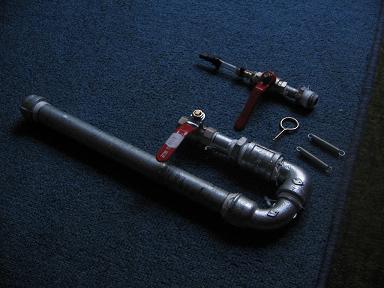I was wondering what would be the best marking substance. Paint would be messy to work with, I didn't try using it. Instead I turned my addension on to flour. So I did some tests. First, earlyer in the day I put some metal fittings together in an over & under design with a ball valve and a piece of metal pipe as the barrel. The ball valve will be spring loaded with tension springs, and a sensitive catch mechanism to trigger it. (pic down the page)