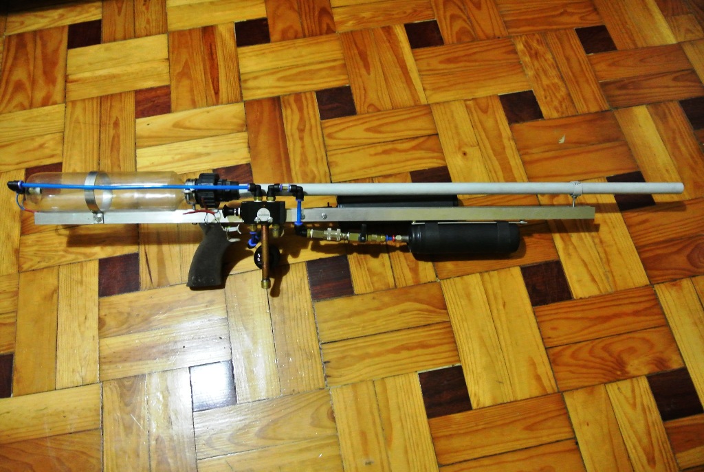 The bottle under the barrel is propane tank, the other grey "tube" is a cheap pump for filling balloons, high volume. Not pressure rated, but it's also isolated from the chamber when firing.